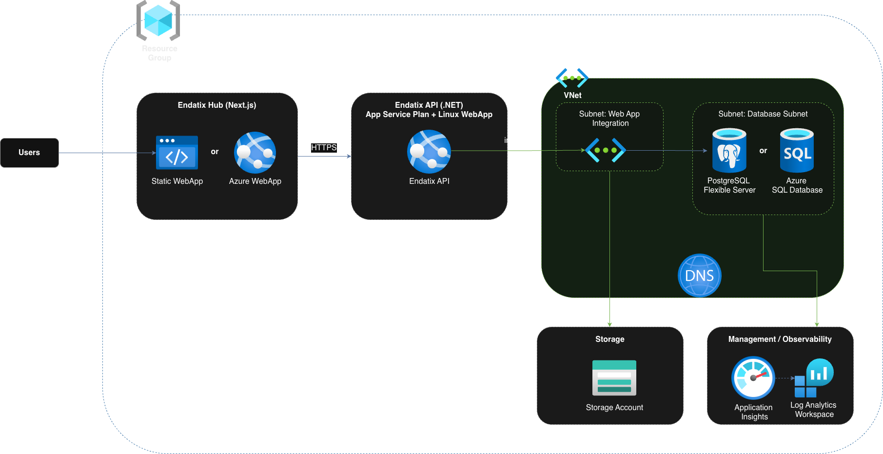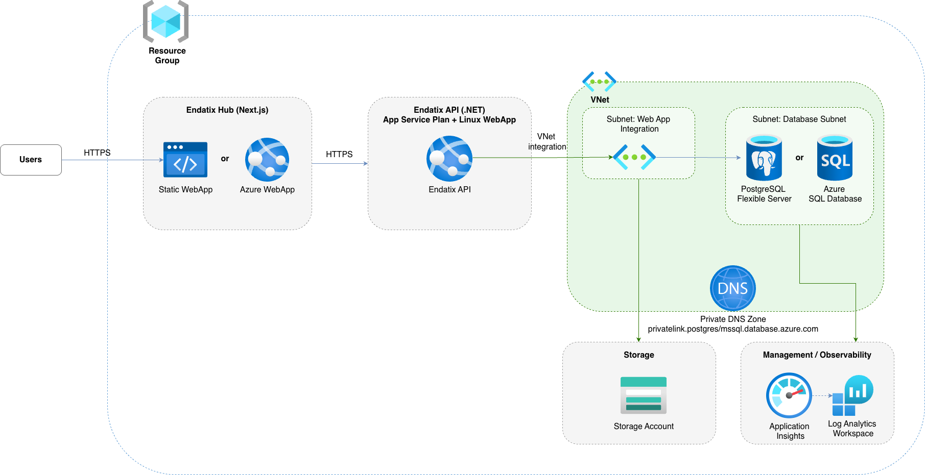 hubDeploymentMode), this is deployed either as an Azure Static Web App (default, highly cost-effective) or as a dedicated App Service Web App (Node.js runtime). - Database (PostgreSQL or Azure SQL): Endatix supports both Azure Database for PostgreSQL Flexible Server and Azure SQL Database (MS SQL Server) for reliable, scalable relational data storage for the Endatix API.