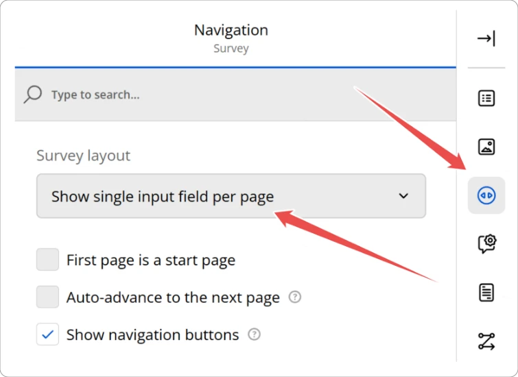 "questionsOnPageMode": "inputPerPage"within the survey JSON configuration or select the “Single input field per page” mode in the Navigation section of the Property Grid (See Form Display Modes):